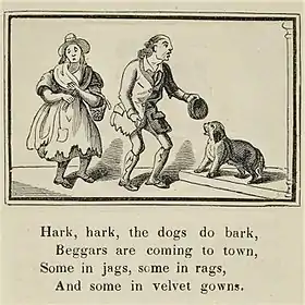 Dating the rhyme's origin is confounded by the existence of another that shares the same first line and overall structure. A lyric appearing in a hand-written text from 1672, also titled "Hark, Hark, the Dogs Do Bark", is not a nursery rhyme and does not address beggars. Instead, its first verse reads:[14]