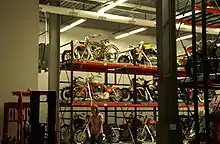 On the museum’s upper level, a procession of motorcycles is displayed down the center of the main hall, running the length of the building, with galleries on either side.[11]
