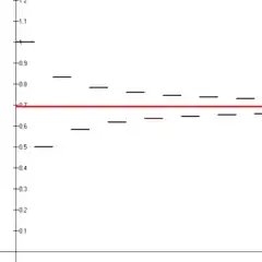 The first fourteen partial sums of the alternating harmonic series (black line segments) shown converging to the natural logarithm of 2 (red line).