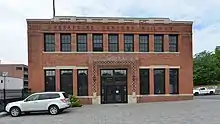 Chesapeake Western Railway Station (1913) is a brick building with two sections, the tow-story front section contains a passenger and office area while the one-story rear section was built for freight. Trim, belt courses, window sills, and lintels on the facade are made of Indiana limestone. The main entrance is ornamented with red-tinted concrete with a crosshatched surface.[3] The building was damaged by fire 1982 and in the 1990's the building was rented out as warehouse space.[3] The building was refurbished as office space and tenants occupied it in July 2016.[4]