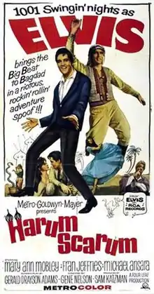 Harum Scarum (released in the United Kingdom as Harem Holiday) is a 1965 American musical comedy film starring Elvis Presley, which was shot on the original Cecil B. DeMille set from the film The King of Kings, with additional footage shot on location at the Iverson Movie Ranch in Chatsworth, Los Angeles. Some of the film was based on Rudolph Valentino's The Sheik released in 1921.[3] The film reached #11 on the Variety national weekly box office chart, earned $2 million at the box office, and finished #40 on the year end list of the top-grossing films of 1965. The film is listed in Golden Raspberry Award founder John Wilson's book The Official Razzie Movie Guide as one of The 100 Most Enjoyably Bad Movies Ever Made.[4]