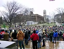 Before cannabis legalization in Michigan, the penalty for cannabis law violations in the City of Ann Arbor was a $30 fine and $25 court costs for a total of $55, and was a civil infraction ticket.[4] The campus falls under state, not city jurisdiction but "for decades, police had in the past exercised discretion and a general tolerance for public marijuana use at the annual Hash Bash. Marijuana is openly consumed annually on the campus and at past events, few, if any, arrests occur. There is a general understanding that during this time, peaceful protesters can engage in the civil disobedience of cannabis consumption and police generally will not enforce state law."[5]