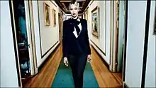 In the various rooms, she meets men wearing vest tops with their faces painted white with black eyes staring at her as she passes down the corridor. Later she meets other people in leather and masks, before being surrounded by a troop of lace-clad dancers. One shot shows a man in colourful clothes and leopard print Speedos surrounded by bubbles in a bathtub. Another room contains a family of four mannequins in a 1960s-styled kitchen, preparing for a plastic-looking meal. A bare African-American is seen dancing and painting herself with a large brush while being almost naked. She is also seen with her legs spread around a TV screen and Beyoncé is seen on it, singing the song. During one scene, Beyoncé performs a dance choreography on a couch along with several other female dancers. Throughout the video, she is seen wearing a tuxedo with a tie, a white fur jacket and platform heels designed by Saint Laurent.[67] The black-and-white jumpsuit she wears is designed by Russian designer Ulyana Sergeenko.[68] Her look is further complete with dark make-up around the eyes and red lipstick while her hair is marcelled and blonde.[69]