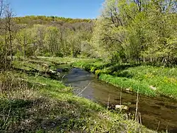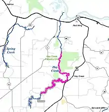 Hay Creek is a small trout stream in southeastern Minnesota. It has its headwaters west of Goodhue and empties into the Mississippi River just to the north of Red Wing.[2] It runs 25.1 miles (40.4 km).[3] Hay Creek was named for the hay meadows near its banks.[4] A railroad once ran along Hay Creek from the claybanks near Goodhue to the pottery and stoneware factories in Red Wing, which also made use of the water from the creek. The railroad was torn up in 1937, but traces such as trestle pilings remain.[5]