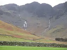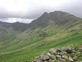 The northern face of Haystacks is topped by crags which giving a soaring curved profile from the settlement of Gatesgarth at their base. On the left in this view is Green Crag, while the highest section, unnamed on Ordnance Survey maps is called Big Stack by Wainwright.[1] Warnscale Beck, one of the feeder streams of Buttermere, runs down beneath Green Crag from its source near Great Round How. There are the remains of extensive quarries on the upper slopes of Warnscale, including Dubs, once served by a tramway from the summit of Honister Pass. Across Warnscale is Fleetwith Pike, a satellite of Grey Knotts.