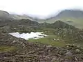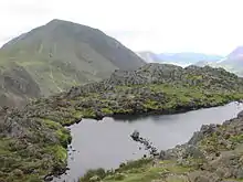 Haystacks, or Hay Stacks, is a hill in England's Lake District, situated at the south-eastern end of the Buttermere Valley. Although not of any great elevation (597 m, 1,958 ft), Haystacks has become one of the most popular fells in the area. This fame is partly due to the writings of Alfred Wainwright, who espoused its attractions and chose it as the place where he wanted his ashes scattered.[1][2] Its large, undulating summit contains many rock formations, tarns and hidden recesses.