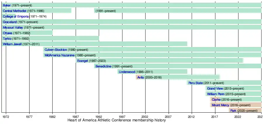 In early 2014, Grand View University and William Penn University were announced as members for the 2015–16 school year.[3] In April 2015, Clarke University and Mount Mercy University were also announced as members for the 2016–17 school year.[4] In October 2019, Park University was approved for HAAC membership and joined in the 2020–21 school year.[5] On February 10, 2022, long-serving Evangel University accepted its invitation to join the Kansas Collegiate Athletic Conference, also Kansas-based, in 2023–24.[6]