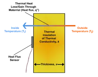 The measurement of heat flux can be performed in a few different manners. A commonly known, but often impractical, method is performed by measuring a temperature difference over a piece of material with known thermal conductivity. This method is analogous to a standard way to measure an electric current, where one measures the voltage drop over a known resistor. Usually this method is difficult to perform since the thermal resistance of the material being tested is often not known. Accurate values for the material's thickness and thermal conductivity would be required in order to determine thermal resistance. Using the thermal resistance, along with temperature measurements on either side of the material, heat flux can then be indirectly calculated.