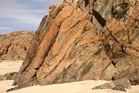 The Lewisian complex consists of mainly granitic gneisses, subject to a series of metamorphic and tectonic events, interrupted by the intrusion of a major dyke swarm.[1]