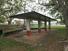 The Hefferan Park air raid shelter is a rectangular concrete structure comprising a heavy floor slab and a flat roof supported by concrete piers. It stands adjacent to a playground under the canopies of mature fig trees in the northern end of Hefferan Park, which is located at a major road intersection, and is near the Dutton Park railway station. The roof of the shelter is painted light green. The bottom sections of the piers are painted red, while the upper sections of the piers are painted white. The floor of the shelter is paved with red and white pavers in a diagonal pattern.[1]