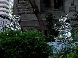 Hehe Xiexie depicts two "cuddly" Giant pandas which, according to Huan, represent a "harmonious society, harmonious world [and] harmonious Expo."[1] They are made of mirror-finished stainless steel and measure 600 centimetres (20 ft) x 420 centimetres (13.8 ft) x 380 centimetres (12.5 ft) and 600 centimetres (20 ft) x 426 centimetres (13.98 ft) x 390 centimetres (12.8 ft).[3] They were manufactured by Zhang Huan Studio and donated by Tomson Group as part of the Collection World Expo.[3]