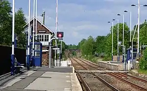 The station is on the Bishop Line[1] which is a community railway from Bishop Auckland to Darlington.[2] It is somewhat unusual in that its platforms are staggered, sited either side of a level crossing.[3] The station has kept its listed manual signal box (which supervises the aforementioned crossing, the connection into the Hitachi plant and the single line section south of here through to Darlington), but this had its semaphore signals replaced by colour lights when the connection into the Hitachi factory was installed and commissioned in November 2014.[4]