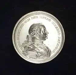 On 26 August 1760, during the second siege of Kolberg, a united force of Swedish and Russian troops surrounded the fortress on water and land. On 27 August, Kolberg was bombarded from the sea by the entire Russian Baltic fleet: twenty-one ships of the line, three frigates and three bomb vessels.[4] On 29 August, they were joined by six ships of line and three frigates of their Swedish allies. Heyde deployed his 700 troops to construct siege works on 6 September; cavalry units covered the construction.[5] He defended Kolberg with his limited number of troops until 18 September, when General Paul von Werner arrived with 3,800 men after a 13-day, 340 kilometres (210 mi) forced march from Silesia. Werner deployed his troops and attacked immediately with such force that the Russians believed they were facing an army of about 20,000; the Russians retreated. Two coins commemorate this act: one with the image of Werner, one with the image of Heyde. The King sent a gold and twenty silver coins with a personal thank you to Heyde. After the second siege of Kolberg, Frederick reevaluated his previously lukewarm opinion of Heyde: I am not infallible; in this man I have been greatly wrong.[1] Financially, Heyde's heroism did not pay off; he received as a commander a salary of 600 taler against of which, shortly before his death, 800 were still owed. Heyde and Werner were promoted to the rank of lieutenant general.[1]