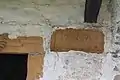 A Zeller family crest (stone carving) hangs over the front door which is also a sign of their faith. The roof is a steep gable style and the original windows were designed for defensive purposes and were narrow and irregularly spaced and measured only twelve by six inches. The exterior walls are constructed of twelve-inch thick limestone covered with stucco.[5]