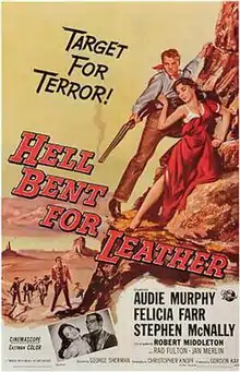 Hell Bent for Leather is a 1960 American CinemaScope Western film directed by George Sherman starring Audie Murphy, Felicia Farr, Stephen McNally and Robert Middleton.[2] The film was based on the 1959 novel Outlaw Marshal by Ray Hogan and filmed on location in the Alabama Hills of Lone Pine, California.