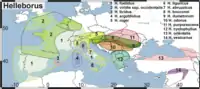 Twenty two species are recognised and divided into six sections.[12] The table below shows the species of the genus helleborus, give its common name, the area of distribution, an image if available and the meaning of the scientific name.[12][13][14] The cladogram shows the relationship between the different species determined with microbiological methods by Meiners et al. (2011).[12]