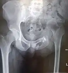 Hemipelvectomy, also known as a pelvic resection, is a surgical procedure that involves the removal of portion of the pelvic girdle. This procedure is most commonly performed to treat oncologic conditions of the pelvis.[1][2] Hemipelvectomy can be further classified as internal and external hemipelvectomy.[1][2] An internal hemipelvectomy is a limb-sparing procedure where the innominate bone is resected while preserving the ipsilateral limb.[1][2] An external hemipelvectomy involves the resection of the innominate bone plus amputation of the ipsilateral limb.[1][2]