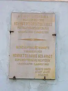 ![]() Memorial plaque for Henriette Hanke on her house in Jawor | |