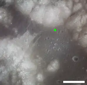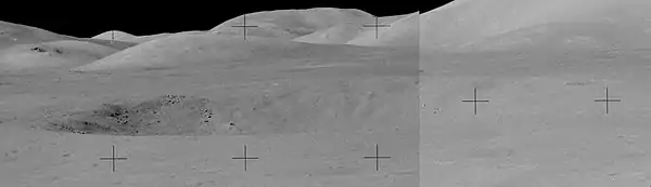 ![]() Location of Henry crater in Taurus–Littrow valley. South Massif is at lower left, North Massif is at top center, and Sculptured Hills are at upper right. Scale bar is 5km | |