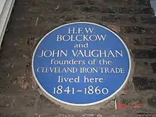 He was persuaded by the ironmaster of the Walkergate works in Newcastle, John Vaughan, to invest in the burgeoning iron trade. At the suggestion of Joseph Pease they set up their first iron foundry and rolling mill at Vulcan Street, Middlesbrough, where they processed pig iron imported from Scotland. In 1846 the pair opened Witton Park Ironworks, 20 miles (32 km) to the west of the town, where ironstone from Grosmont, could be smelted in blast furnaces to produce the pig iron for the Vulcan Street works.[2] The high transport costs generated by this operation led the partners to look closer to home for their raw materials, and in the end they found what they were looking for on their own doorstep. In 1850, Vaughan and his geologist John Marley discovered large seams of iron ore at Eston, in the nearby Cleveland Hills. A year later they began mining there, and soon a branch railway line was built to transport the ore to Middlesbrough.[3]
