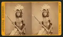 Beyond his work in the studio, Buehman took periodic trips through Arizona Territory. In the summer of 1875, he collected flowers, plants, birds nests, eggs and birds with his friend John Spring. The collection was donated to the Smithsonian Institution.[1] A six-week trip to Fort Apache, Fort Bowie, Camp Grant and San Carlos Reservation beginning in December 1875 produced stereoscopic pictures of various Native Americans at the various posts, including Pinal Apache chief Eskiminzin.[22] Later trips saw Buehman spends weeks at a time with local tribes or photographing various places of interest in southern Arizona.[23] Motivation for these trips was primarily commercial instead of artistic. As his portfolio of images grew he made deals with dime novel publishers and sold copies directly to the public. Buehman's images were also used as part of a "Sell Arizona" campaign.[15] By the 1893 Chicago World's Fair his catalog of images available for purchase included 10,000 photographs of Native Americans.[24]