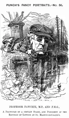 After repeated defeats as a Liberal Party candidate, Henry Fawcett was elected Member of Parliament for Brighton in 1865. He held this seat until 1874, and thereafter represented Hackney between 1874 and 1884. He campaigned for women's suffrage. In 1880, he was appointed Postmaster General by William Ewart Gladstone and sworn of the Privy Council.[6]