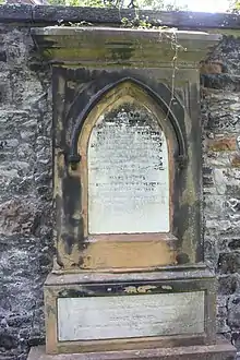 He is buried in St Cuthbert's Churchyard at the west end of Princes Street[10] with his wife Margaretta (1786–1858) and children Emily Isabella and George Edward Grey. The grave lies in the north-east corner of the northernmost section, abutting the churchyard of St John.