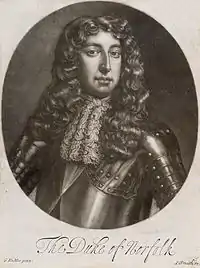 On 20 June 1685, he was appointed Colonel of the Suffolk Regiment, which at the time was called the Duke of Norfolk's Regiment of Foot. He was created a Knight of the Garter in the same year. As a man "all-powerful in his Dukedom"[5] he used his influence in the 1685 General Election to return members entirely loyal to the Crown (as his father had in 1673 when he found a safe seat at Castle Rising for Samuel Pepys). By 1688, however, he was on bad terms with James II, openly disapproving of the King's aggressive policy of Catholic championship. When asked to question his constituents on whether they favoured repeal of the Test Act, he replied bluntly that he knew that all those in favour of repeal would fit comfortably in one coach.[6] When asked to replace the magistrates in his dukedom with more compliant ones he simply refused and prudently went to France,[7] but returned in time to welcome the Glorious Revolution.
