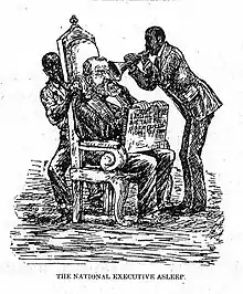 Lewis' early work for The Freeman covered various topics, particularly around race i.e. lynching. However, the most common theme of his cartoons included biting criticism on President Benjamin Harrison and his Republican administration, for failing to support job opportunities for blacks, and on politicians' general refusal to acknowledge the importance of racism.[2][4] His cartoon of Harrison, unconscious and sitting on a throne, as black men blared bugles at him, sparked controversy, especially in Indiana where Harrison had been U.S. Senator before being elected President.[2][4]