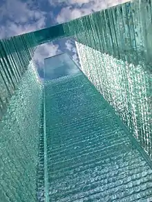 Richardson treats glass as a transparent stone, using a hammer and chisel to shape it. He has developed a method of bonding the layers together with a polymer silicate and UV light. The layers are then sculpted into large abstract spheres, columns and spirals which appear "ethereal" and light despite their weight.[6] As the work evolved, Richardson began adding color, mixing his own pigments and infusing them into the glass.[7]