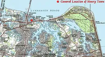Henry Town, Henry Towne, or Henries Towne was an early English colonial settlement near Cape Henry, the southern point and gateway to the Chesapeake Bay in the Colony and Dominion of Virginia, now in modern Virginia Beach, Virginia, on the East Coast of the United States. Archaeologist Floyd Painter of the Norfolk Museum of Arts and Sciences (now the Chrysler Museum of Art) originally excavated the site in 1955, but it was only conclusively determined to be Henry Town in 2007 by United States Army scientists reviewing the site's artifacts, and no primary source documents exist (save those supposedly held by one now-deceased archaeologist). It was located east of Norfolk, Virginia and north of Chesapeake and south of the Hampton Roads harbor at approximately 36°54′30″N 76°7′20″W. The historical and archeological site is immediately north of U.S. Route 60 (Shore Drive) on what is now Lake Joyce, formerly an inlet connecting with Pleasure House Creek, a western branch of the Lynnhaven River, itself an estuary of the Chesapeake Bay and Hampton Roads.