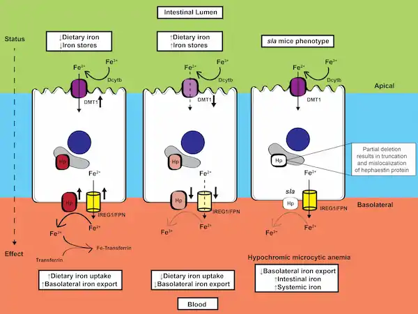 In addition to the truncation of the original protein, the iron-deficient sla phenotype may also be explained by the intracellular mislocalization of hephaestin. Wild type hephaestin localizes in a supra nuclear compartment as well as the basolateral surface.[10] In contrast, sla hephaestin seems to localize only in the supranucelar compartment but is largely undetectable in the latter.[11] Given hephaestin's established function in facilitating basolateral iron export, this mislocalization may explain the paradoxical intestinal iron accumulation and systemic iron deficiency observed in sla mice.