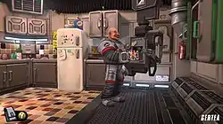 Due to the outcome of the United Kingdom European Union membership referendum, the game had to be rewritten and some jokes adjusted in order for some parts to make sense. For example, a self destruct button in the player-character's spaceship has an Article 50 sticker imprinted on it, and the game also contains some references to Nigel Farage. Barr thought that the game could benefit from these references and the outcome of Brexit and even hoped that it would be marked as the "Official Brexit Game", but was concerned that a European audience would find its tone arrogant. In light of this, the team had to make some adjustments while trying to keep game's satirical tone. As a result of this, a late addition to the game was to add in the option of using either an English voice or an American voice. If American dialogue is chosen, a laugh track is played after an appropriate joke so that its audience would be able to understand whenever a joke is happening.[3]