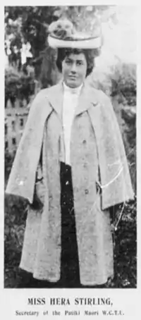 At the start of the twentieth century, Stirling worked with many different Māori iwis to establish local chapters of the Women's Christian Temperance Union New Zealand (WCTU NZ) in Wanganui, New Zealand.[1] In March 1905 she formed the Pūtiki Maori Christian Temperance Union with Mrs. R. Davis (daughter of Taitoko Keepa Te Rangihiwinui, Major Kemp) elected president, Hena Stirling as secretary, Mark Peneaha as treasurer, and Matthew Patopu assistant secretary.[6] She continued to sing evangelist songs to public audiences, for example at the WCTU NZ convention in 1905 at Wanganui.[7]