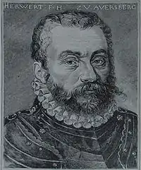 Herbard's father was Trojan von Auersperg, his mother Anna a Freiin (i.e. baroness) von Egck. After attending the municipal school in Vienna he was sent for several years to the court of Cleve which was among the many European relations of the Auerspergs.[1] 1546 he started on his successful military career under Ivan Lenković at the "Windic" border (Upper Slavonian Krajina) and after only two years, hardly 20 years old, was made Captain of the strategically important Uskok centre of Zengg/Senj on the coast of Dalmatia in 1548, and in March 1550 he was made a baron (“Freiherr”).