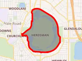 ![]() The western shore of Herdsman Lake with the skyline of Perth in the background | |||||||||||||||