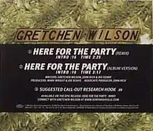 "Here for the Party" is a song co-written and recorded by American country music artist Gretchen Wilson. It was released in July 2004 as the second single and title track from her album Here for the Party. The song was Wilson's second chart entry on the country charts. It has been certified Gold by the RIAA. Wilson wrote this song with Big Kenny and John Rich, who comprise Big & Rich.