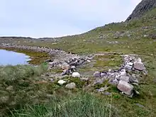 The diggings also revealed other buildings besides the church, including the main house and adjoining banquet hall, a byre and some outbuildings. In the ruins of the church, archaeologists found a significant quantity of charcoal, suggesting a conflagration at some point. The local Inuit's name for the site, Ikigait ("the place destroyed by fire") is further evidence of this.[18] It is possible that other buildings at the site were even closer to the shoreline than the church, and were claimed by the rising sea level some time after the disappearance of the Norse. More recent soil-testing indicates a landslide occurred at some point in the 18th century, and may have eradicated the remains of other Norse buildings at the site.[19]