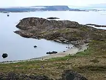 - A kayker's photograph of the approach to Herjolfsnes, looking northeast. The church ruins are on the middle left immediately above the grey coloured strand.