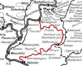 The Herlasgrün–Oelsnitz railway is a branch line in the German states of Saxony, which was originally built as a section of the Voigtland State Railway from Herlasgrüner to Cheb. It starts at the junction station of Herlasgrüner on the Leipzig–Hof railway and runs via Auerbach to Falkenstein. The southern part of the line from Falkenstein via Bergen to Oelsnitz was closed in 1951.