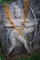 A hero stone was usually divided into three panels, but occasionally, into four or five panels depending on the event. The upper panel depicts the subject worshiping a deity such as a Shiva linga, vishnu, gaja lakshmi or jain tirthankara, the middle panel depicts the hero sometimes seated in a palanquin or a shrine being lifted toward the heavens by apsaras (heavenly nymphs), and the lower panels would display battle scenes.[8] One of the largest Viragallu, about 12 feet high is found in Betageri, Karnataka.[9] In Tamil Nadu, Department of Archeology found several hundred hero stones that had been erected in the memory of warriors who sacrificed their lives defending their community or region. Those that are carved with inscriptions narrate the act of the hero, the battle, and the name of king who fought the battle. The stones are found alone or in groups, often near an irrigation tank or lake outside a village.[10] One hero stone dating to the 9th century Pallava King Dantivarman, depicts the hero riding a galloping horse beautifully dressed and carrying a spear.[11] Another was recovered at Pappapatti in Usilampatti taluk and probably dates from the 18th century. This stone shows a warrior posed heroically, accompanied by his wife who holds a flower. Creating hero stones had been prevalent since the Sangam period dating back 2300 years,[12] and continuing until the Nayaka and post-Nayaka period to about 19th century.[13] In March 2014, a hero stone dating to the 8th century Pandya country, with an inscription in Tamil vatteluttu script was found in Vellalankottai in the Tuticorin district.[7] and another that was installed by a woman in memory of her husband who killed a leopard preying on cattle that strayed into the hamlet.[14] In 2017, two rare hero stones raised in honour of warrior-women riding to a battle were found, dating back 13th century.[15]