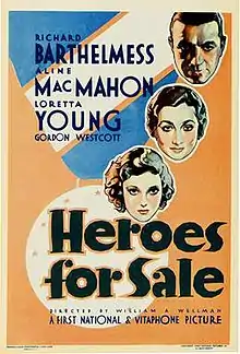 Heroes for Sale (1933) is an American pre-Code drama film directed by William Wellman, starring Richard Barthelmess, Aline MacMahon, and Loretta Young, and released by Warner Bros. and First National Pictures. The 76-minute original is considered lost; a 71-minute version is available from Turner Entertainment.