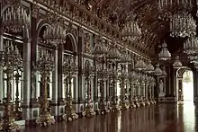 The palace was shaped in a 'W' with wings flanking the central edifice. Only 16 of the 70 rooms were on the ground floor.[2] Though it was to have been an equivalent to the Palace of Versailles, only the central portion was built before the king died and construction was discontinued with 50 of the 70 rooms still incomplete. It was never intended to be a perfectly exact replica of the French royal palace. Like Versailles, the Hall of Mirrors has 17 arches, the Hall of Peace and the Hall of War on either side have six windows each. The window niches at Herrenchiemsee are slightly wider than those at Versailles, making its central façade a few metres wider. The dining room features an elevator table and the world's largest Meissen porcelain chandelier. Technologically, the building also benefits from nearly two centuries of progress. The original Versailles palace lacked toilets, water, and central heating, while the New Palace has all of these, including a large heated bathtub.