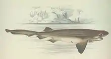 The bluntnose sixgill shark (Hexanchus griseus), often simply called the cow shark, is the largest hexanchoid shark, growing to 20 ft (6.1 m) in length.[2] It is found in tropical and temperate waters worldwide and its diet is widely varied by region. The bluntnose sixgill is a species of sixgill sharks, of genus Hexanchus, a genus that also consists of two other species: the bigeye sixgill shark (Hexanchus nakamurai) and the Atlantic sixgill shark (Hexanchus vitulus). Through their base pairs of mitochondrial genes COI and ND2, these three species of sixgills widely differ from one another.[3]