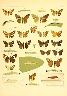 | Hidari irava Moore in Rhopalocera of Java (figure 85 a. male b.larva c.pupa ) | |