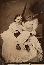 The daguerreotypes that became publicly available during the 1840s had exposure times from tens of seconds to several minutes.[1][2] While exposure times shrank as photographic technology developed, to get a clear picture of a child during the 19th century the child had to be persuaded to stay still, which could be difficult to achieve.[3] One technique was for the mother—sometimes the father, a nanny or the photographer's assistant—to be hidden within the frame, often behind curtains, under cloaks, or disguised as chairs.[3] Mothers were also sometimes obscured simply by removing parts of the photograph afterward, or by them standing slightly off to one side so they could be cropped out.[3] How successfully the mother was hidden varied. Sometimes, simply draped with fabric, their shape would be obvious. In some photographs, arms are clearly visible.[4] A paper overlay could be used when framing the photograph to hide the parts showing the mother, focusing on the child instead.[5] The practice of hidden mother photography continued into the 1920s, fading away as cameras became faster and more ubiquitous.[6]