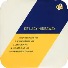 "Hideaway" is a song by American house-music group De'Lacy, featuring vocals by Rainie Lassiter. It is the group's most successful single and is written by Kevin Hedge and Josh Milan, and produced by Blaze. The Deep Dish remix peaked at number-one in Italy.[2] It also reached number nine in the UK[3] and number 38 on the Billboard Hot Dance Club Play chart in the US. The song has been remixed and re-released several times. A remixed version, called "Hideaway 1998", which featured a mix by Nu‑Birth,[4] peaked at number 21 in 1998. The song was released a third time in 2006 and reached number 82 in the Netherlands.