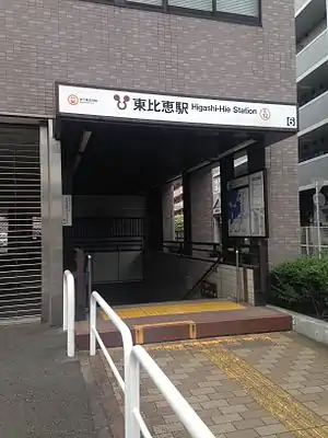 Higashi-Hie Station (東比恵駅, Higashi-Hie-eki) is a train station located in Hakata-ku, Fukuoka in Japan. The station's symbol mark is Hie's initials "ひ" looks like earthenware, because Hie remains, and "ひ"'s each edges circle mean Hakata and Airport.