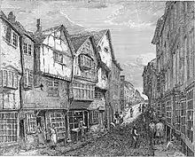 The area covered by the street lay outside the walls of Roman Eboracum, although archaeological evidence has been found of a bathhouse on the corner of Spurriergate, and temples to Hercules and the Emperor on the corner of Nessgate. Items associated with Viking Jorvik have also been found, but at this time, the area appears to have been a large open space. However, with the construction of the Ouse Bridge, Ousegate emerged as the route east from it. The street was first recorded in the 1120s, by which time the area appears to have become built up with houses, including at least one built of stone, and the churches of All Saints, Pavement and St Michael, Spurriergate. By the 14th-century, the street was known for its lorimers (makers and sellers of metalwork for bridles and other horse furniture) and spurriers.[2][3]