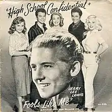 Jerry Lee Lewis recorded the song at the Sun Studio on February 14, then went to California, where the director set him, his bass player Jay W. Brown, his road drummer Russ Smith, and their instruments on the top of a flatbed truck and had Lewis lip-synch the song to a crowd of fake high school kids.[2] During this session Lewis recorded at least 14 takes of "High School Confidential" (no other songs were recorded), but at that time not a single take from this session was released. The takes from this session were officially released only in early 1980s: one take on Sun LP 1004 Wild One at the High School Hop (UK, 1982) and three takes on Charly Records 12-LP boxed set Jerry Lee Lewis: The Sun Years (UK, 1983). Lewis returned to this song on April 24, 1958, when he recorded three down tempo takes of it. The splice of two takes (3 and 1) from this session was released as the side A of the single Sun 296[3] in May 1958 (doubled by UK single by London Records HLS.8780 in January 1959), on EP Sun EPA 110 (UK RES.1187) and on the first self-titled album by Lewis, Sun LP-1230 (UK HAS.2138), all US releases in the same year 1958.[4][5] The film version was never released.